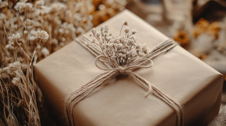 Close-up of a rustic-style gift box wrapped in brown kraft paper and tied with twine, decorated with dried flowers.