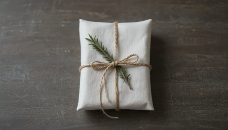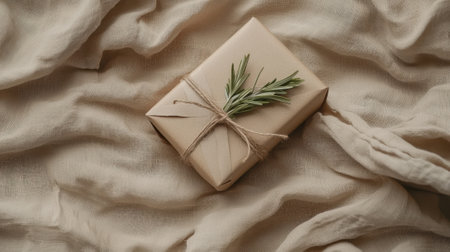 A gift box wrapped in brown paper and tied with twine sits elegantly on a light, textured fabric. Fresh herbs add a natural touch to the presentation.
