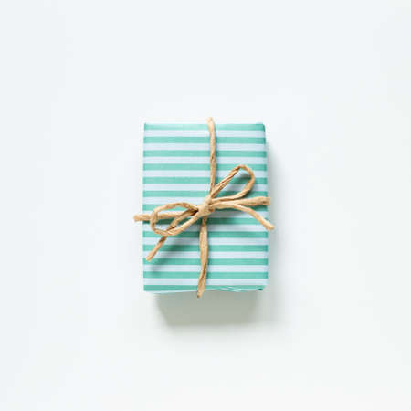 Top view on a wrapped in paper gift for birthday, Christmas, or other celebration on white wooden background. Gift box with tag and ribbon. Birthday present. Wrapping gift idea.