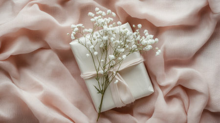 Gift box with delicate gypsophila flowers on a soft pink cloth, generative ai