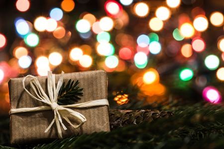 A beautifully wrapped gift box with a ribbon on a wooden table, with a blurred Christmas tree in the background adorned with lights