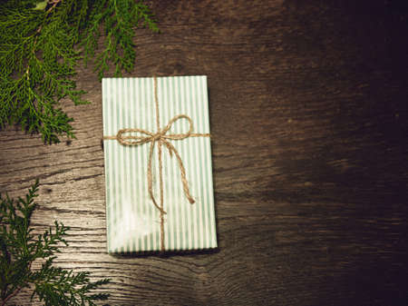 Christmas background with gift wrapped in kraft paper, decorated in Eco-style. Christmas background for presentation of work or text. Copy space.