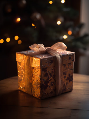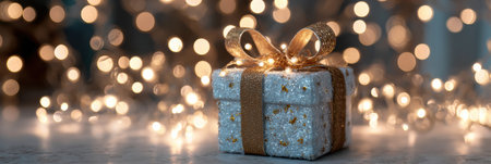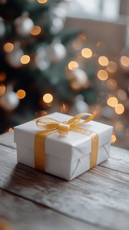 A white gift box with a shiny golden ribbon is placed on a wooden surface, surrounded by soft bokeh lights and festive ornaments. The cozy holiday atmosphere is enchanting and warm.