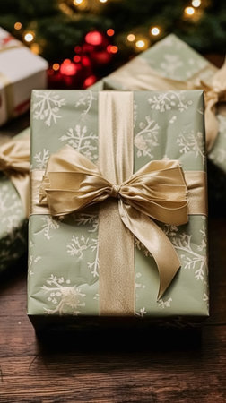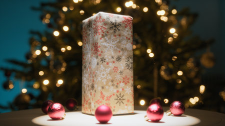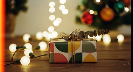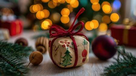 A beautifully wrapped Christmas gift box adorned with a festive tree design and red ribbon, surrounded by ornaments and pine branches, with a bokeh background of warm lights.