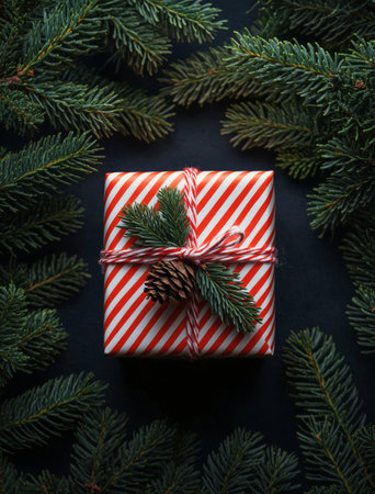 A beautifully wrapped gift decorated with red and white stripes rests on a dark surface, surrounded by fresh pine branches and a pine cone, evoking a warm holiday atmosphere.