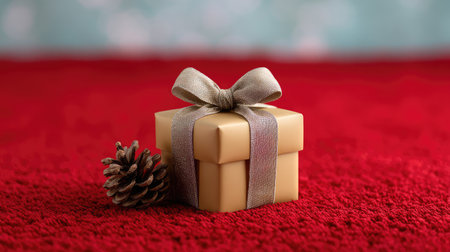 Gift box laying on red carpet with pinecone and lights nearby, warm mood and clear area above for messages