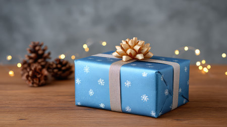 A beautifully wrapped blue gift box with a gold bow and snowflake design, placed on a wooden surface with pine cones and twinkling lights, creating a festive atmosphere.