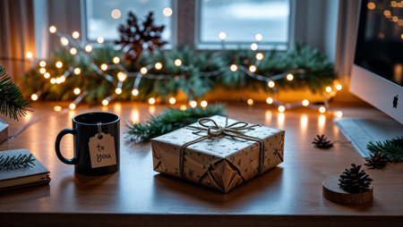 A cozy office desk decorated for the holidays with a beautifully wrapped Secret Santa gift, warm lights, pine details and a festive atmosphere.