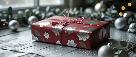 Red Christmas gift box wrapped in floral paper with a ribbon, surrounded by silver ornaments and greenery on a wooden table near a window.