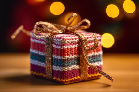 Abstract Christmas background with gift box woven from knitting threads. Template for greeting card with copy space for text. Generative AI.