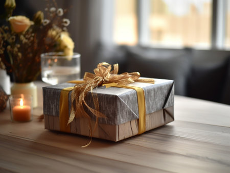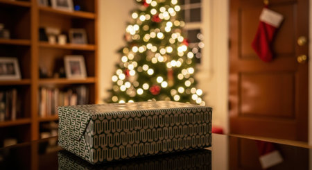 A beautifully wrapped gift waits to be unveiled in a cozy warm setting.
