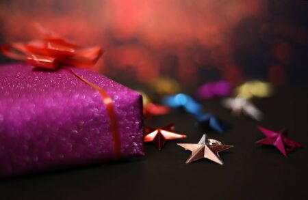 Morning with scattered podrochnymi boxes on bed. Christmas presents with red ribbon. Happy new year and winter holidays. Flat lay. Selective focus.