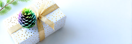 Gift box wrapped in white paper with gold dots, decorated with golden ribbon and colorful pine cone