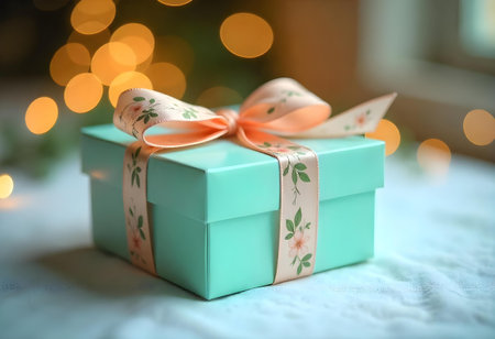 A stunning turquoise gift box adorned with delicate floral ribbon sits on a soft surface, surrounded by warm golden bokeh, evoking a festive atmosphere of celebration and joy.