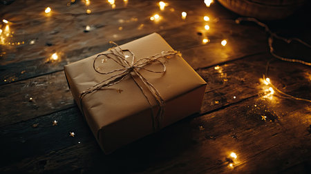A minimalist New Year gift box wrapped in eco-friendly paper and ribbon, surrounded by fairy lights.