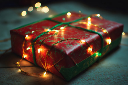 Red and green Christmas present wrapped with string lights on a wooden table, creating a festive warm atmosphere
