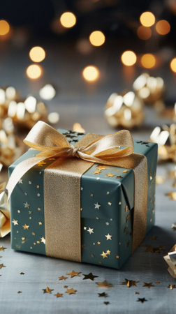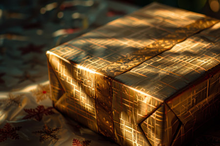 A beautifully wrapped holiday box sits unwrapped, adorned with sparkling lights that reflect a warm and festive vibe, perfect for gatherings and celebrations.