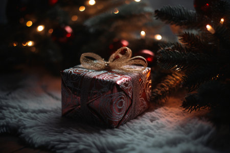 Holiday background with a beautifully wrapped gift box next to a pine tree, setting the perfect festive mood for the Christmas season.