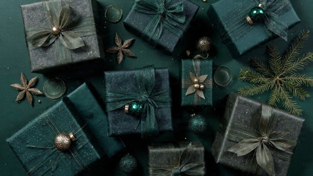 Gift boxes with christmas ornaments on dark green background