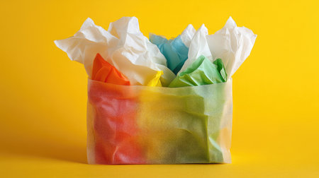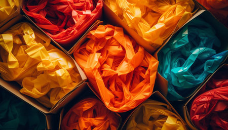 Brighten your day with this image of colorful tissue paper arranged in a decorative box, ideal for celebrations, gifts, and festive occasions.
