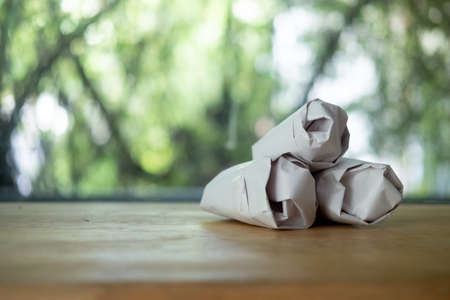 Wrapping paper tied in a knot. Crumpled piece of paper with a torn edge. Abstract background. Eye level shooting. Selective focus. Close-up.