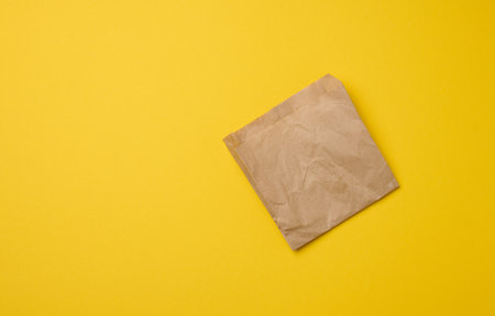 Brown paper craft bag for food packaging on a yellow background, top view