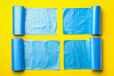 Rolls of garbage bags on color background