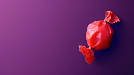 Single red candy wrapped in shiny cellophane against purple background