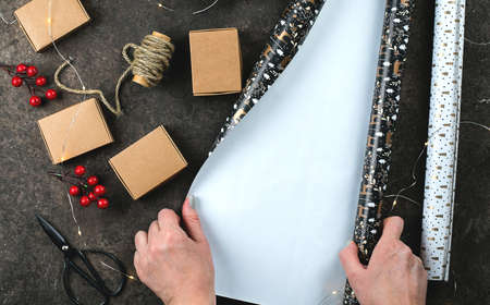 female hands are wrapping Christmas gifts, craft paper, scissors, ribbons, christmas decor on a dark background, eco style, zero waste concept, top view, layout