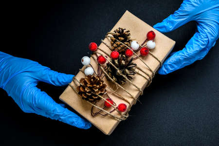 Holiday shopping. Festive gifts. Pandemic restriction. Winter shopping. Hand in protective gloves holding present zero waste box. Advertising background. Copy space. Zero waste christmas. Christmas pandemic. Covid-19 protection. Stay safe. New Year 2021.