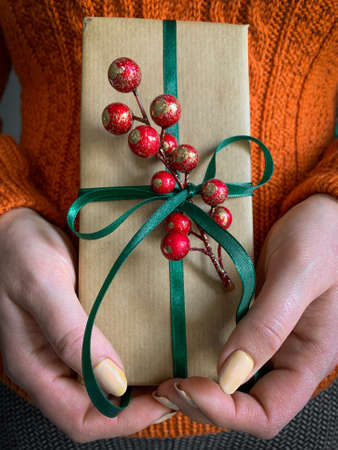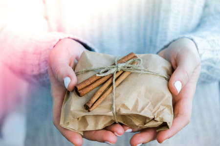 Woman giving Box with New Year's gifts, wrapped in craft paper and decorated with cinnamon sticks. Holidays and gifts concept. Handmade Eco friendly alternative green Christmas presents zero waste Sustainable lifestyle