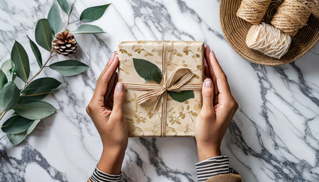 female hands holding a zero waste giftbox on the marble background top view generative ai