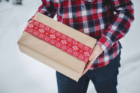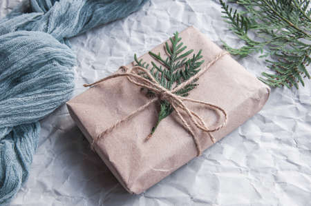 multilayer packing of a holiday parcel. handmade present wrapping. gift for birthday, new year, thanksgiving, valentines day and other holidays.