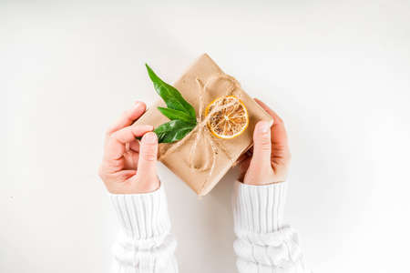 Woman hands holds christmas gifts. Female hands with rustic decorated gift boxes, in craft paper and organic decorations. Top view copy space