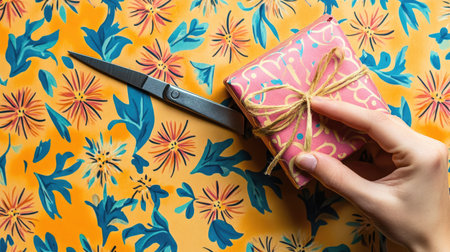 A hand carefully cutting wrapping paper with scissors, preparing a gift for a special occasion
