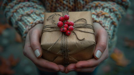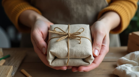 A person delicately holds a beautifully wrapped gift, tied with twine, amidst a warm, rustic environment, capturing the essence of thoughtful giving.