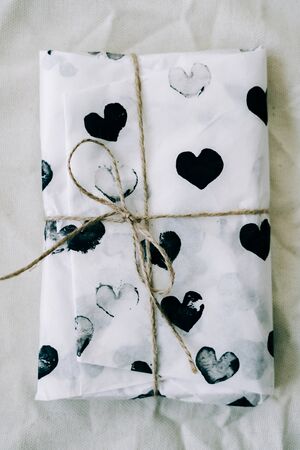 a gift in homemade wrapping paper with black hearts for Valentine's day