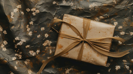 A minimalist kraft wrapped gift with a decorative fabric ribbon, placed on a soft textured surface, showcasing a serene and elegant presentation for special occasions