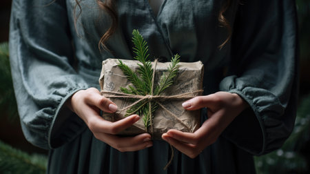 Close-up of hands holding a wrapped package tied with twine, evoking themes of simplicity, vintage aesthetics, and heartfelt gifting.