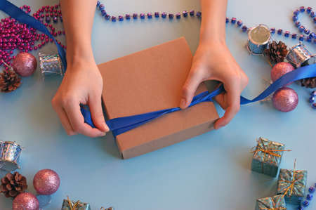 Christmas gift craft box on a blue background with decoration. Happy new year background
