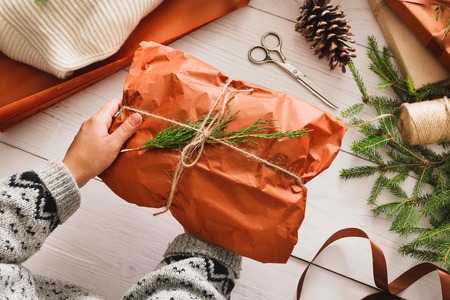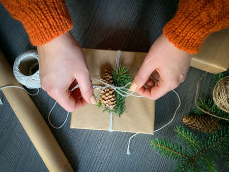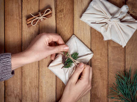 Zero waste and eco friendly christmas concept. Female hands wrap gifts in natural fabric with ornaments made of natural materials
