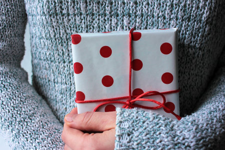 Woman hand with gift box. Person in gray knitted sweater holding present in red polka dot wrapping paper