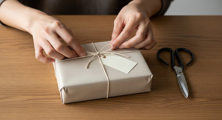 Japanese hands wrap a present using plain paper and cotton string on a wooden table. Natural textures emphasize careful winter gift prep.