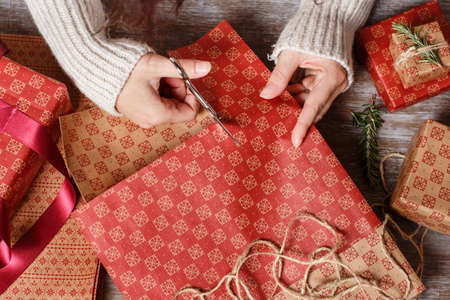 Close up woman hands packing and wrapping Christmas gift boxes with red paper, high angle view