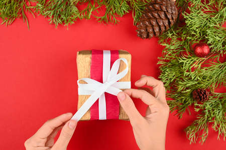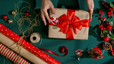 Top view of female hands holding a beautifully wrapped Christmas gift in kraft paper with a shiny red satin bow. Festive decorations surround the gift, creating a warm and joyful holiday atmosphere.
