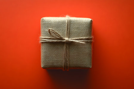 A textured burlap-wrapped gift box tied with rustic jute twine is set against a vibrant orange background. the contrast highlights the natural materials, making it ideal for festive or eco-friendly themed projects. Generative AI