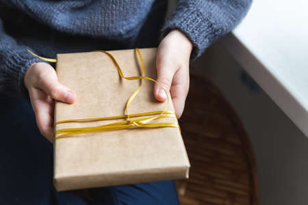 A child in a warm gray sweater sits by the window and holds a gift wrapped in kraft paper and tied with a gold ribbon. Eco-friendly packaging concept. Present books or a box of chocolates.