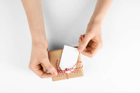 Woman holding parcel wrapped in kraft paper with tag on white background, top view