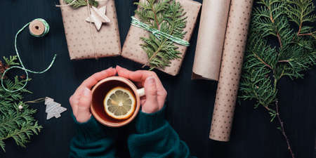 Christmas gift boxes wrapped in kraft paper and decorate with cypress branches on rustic wooden background. Womans hand holding cup with tea. Top view