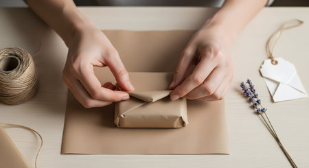 A close-up overhead shot of hands carefully wrapping a small gift box in brown kraft paper. The table is arranged with twine, lavender sprigs, and gift tags, suggesting an eco-friendly and handcrafted approach.